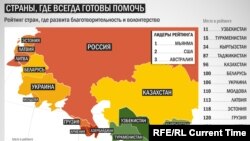 Фонд поддержки и развития филантропии CAF провел исследование человеческой щедрости и готовности помочь ближнему в 140 странах мира. Исследовалась как готовность людей отдавать деньги на различные благотворительные проекты и заниматься бесплатной волонтерской работой, так и простая готовность помочь незнакомцу - накормить его или поделиться с ним последней рубашкой.