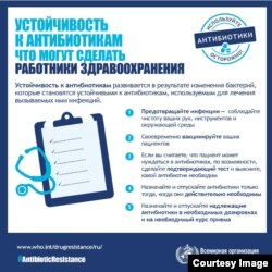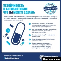 Всемирная организация здравоохранения подготовила инфографику, чтобы показать, как формируется устойчивость к антибиотикам и как ее не допустить.