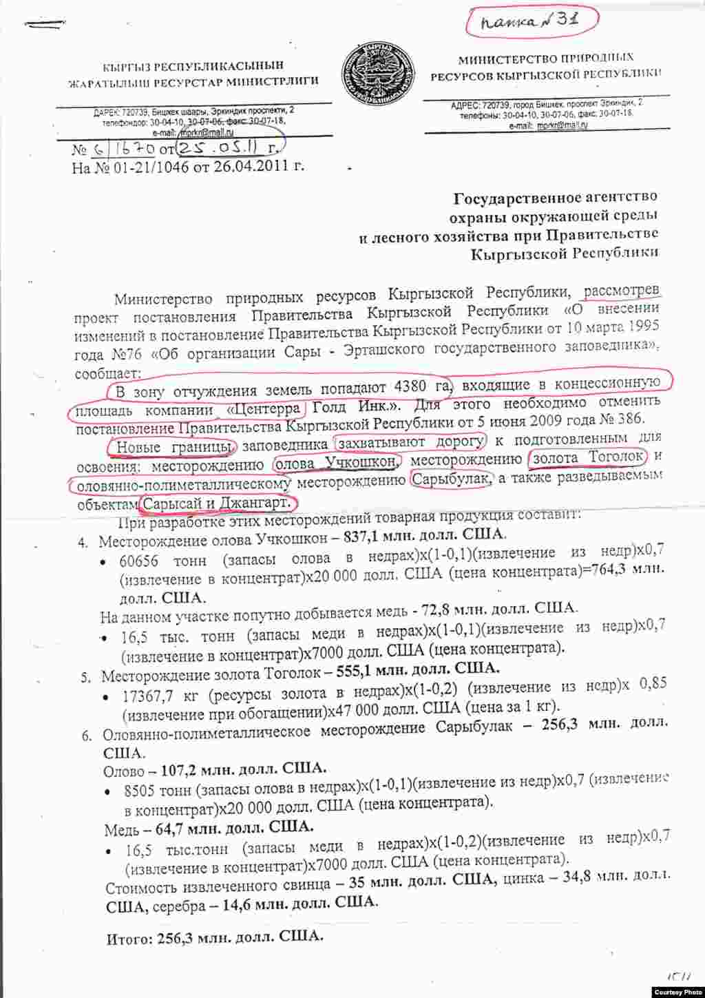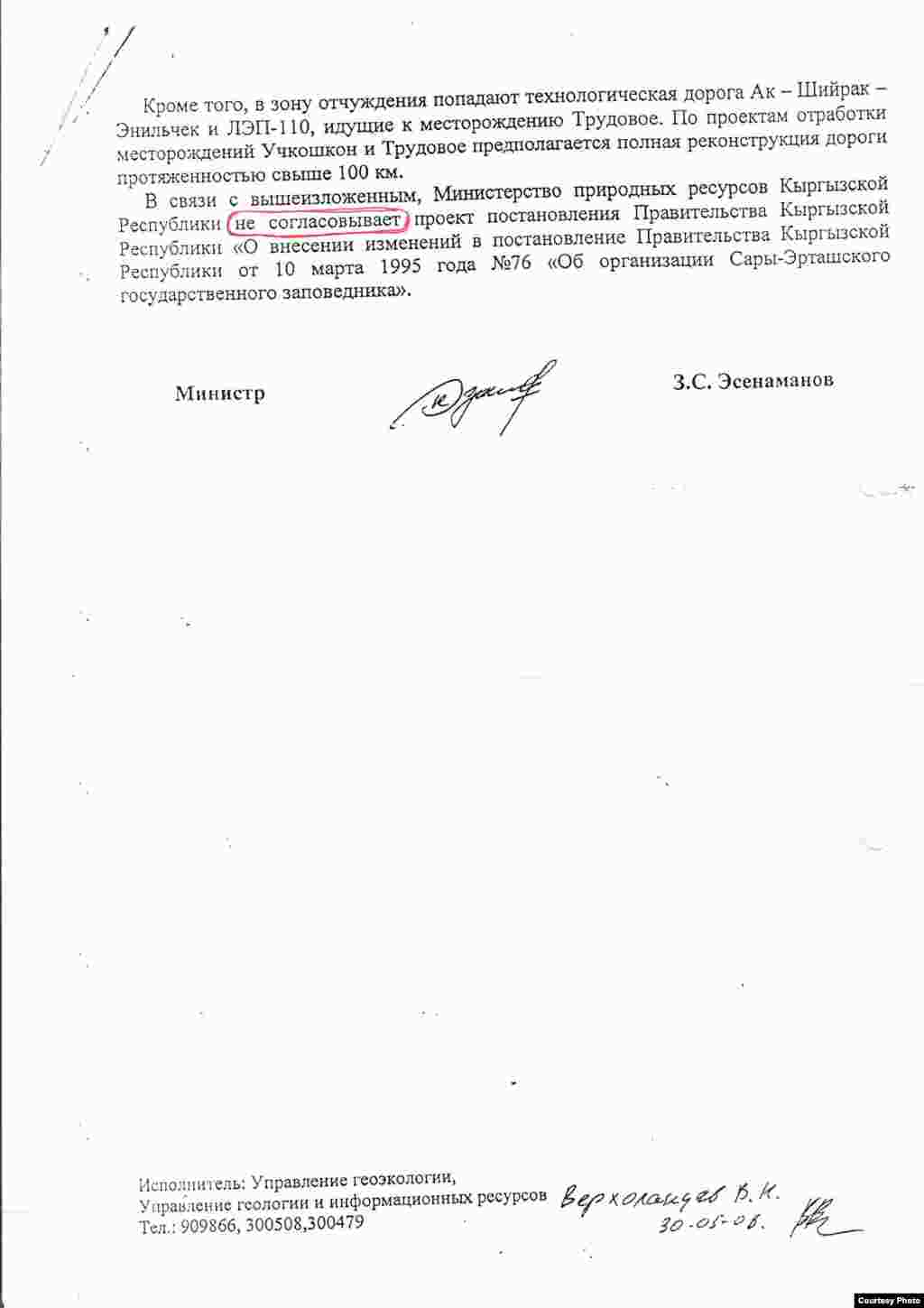 Письмо министра природных ресурсов Замирбека Эсенаманова правительству
